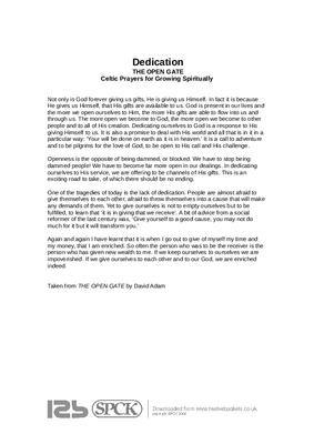 Not only is God forever giving us gifts, He is giving us Himself. In fact it is because He gives us Himself, that His gifts are available to us. God is present in our lives and the more we open ourselves to Him, the more His gifts are able to flow into us and through us. The more open we become to God, the more open we become to other people and to all of His creation. Dedicating ourselves to God is a response to His giving Himself to us. It is also a promise to deal with His world and all that is in it in a particular way: ‘Your will be done on earth as it is in heaven.’ It is a call to adventure and to be pilgrims for the love of God, to be open to His call and His challenge...