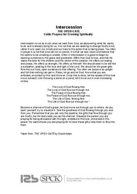 Intercession is not so much what we want from God, as discovering what He wants to do and is already doing for us. It is not that we are seeking to change God’s mind, rather it is to open our minds and our lives to His action that is taking place. Too often in prayer it is not that God will not or cannot; it is that we lack vision and believe that He seems to be unwilling or unable. Often in intercession it is good to begin by opening ourselves to His grace and goodness. Affirm that God is love, and that He wants the best for His children and the whole of His creation. He offers us healing and peace, He offers us strength, He offers us Himself. We should seek to be still like a sunbather, soaking in the love and light of the Lord. We should let His great gifts flow into our lives, open ourselves to that offering. Too often we become so uptight and full that nothing can get in. Relax, let go and let God. Know that you are enfolded, encircled by Him and His love. Once this is done, let the ripples of this love move outward. Like throwing a stone on a pond, let it move out in ever-increasing circles...