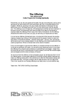 Remember, it is we who are guests at His table. We are not inviting the Lord to come among us; He has invited us to come and share with Him in the great feast of His kingdom. Whatever we bring in the way of gifts and talents it is because He has given them to us: ‘All things come from you, O Lord, and of your own do we give you.’ The offering is one of response, of thanksgiving for all that we have received. In the early church, the bread and wine were brought to the altar by the people to express visibly the offering of their crops, their works, themselves. So the offertory should be the whole of our lives: our joys, our sorrows, our hopes and our fears...
