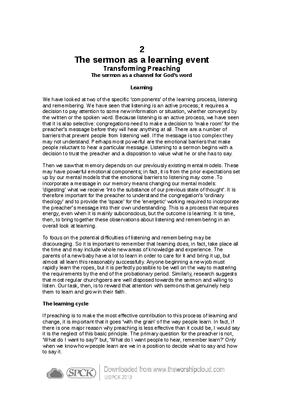 We have looked at two of the specific ‘components’ of the learning process, listening and remembering. We have seen that listening is an active process; it requires a decision to pay attention to some new information or situation, whether conveyed by the written or the spoken word. Because listening is an active process, we have seen that it is also selective: congregations need to make a decision to ‘make room’ for the preacher’s message before they will hear anything at all. There are a number of barriers that prevent people from listening well. If the message is too complex they may not understand. Perhaps most powerful are the emotional barriers that make people reluctant to hear a particular message. Listening to a sermon begins with a decision to trust the preacher and a disposition to value what he or she has to say…