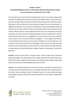 This thesis explores the roots of East Africa Yearly Meeting, at the time of writing the largest Yearly Meeting of the Religious Society of Friends in the world, with 50,000 members. The study centres on the American Friends’ Mission to Kaimosi, British Colonial Kenya between the arrival of three Quaker Missionaries in 1902, and 1946, when African Friends took charge of their own Yearly Meeting. It is suggested that Quakerism was so successful in Kenya because an American Evangelical tradition was employed there and because Western medicine and especially education were central parts of what conversion offered. However, it was ultimately African Friends who were responsible for the spread of Quakerism. The author considers the challenges of Quaker testimony in working within the British Colonial administrative system and in engaging with the various tribes of Kenya, where traditional cultural practices could include beer-drinking and polygamy. It is also suggested that Western misunderstanding of local customs and communication damaged the success of Quakerism, as did the failure to build on Peace Testimony with the Maragoli, a tribe who were most open to the faith and whose community was based on concepts of peace. The author alludes to the impact of Quakers or Quaker education on post-Colonial Kenya, its peaceful transition to independence, its politics and governance.