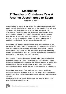 Joseph reeled in agony at the news. He had just heard that back home, many infant lives had been lost at the hands of Herod, who, frightened that a newborn baby would take his throne, had murdered all the boys under two years old, hoping to kill Jesus before he had chance to threaten. Joseph felt the pain of the dreadful loss of so many boys. He recalled the words of the prophet, ‘A cry of anguish is heard in Ramah, weeping and anguish unrestrained; Rachel weeps for her children’...