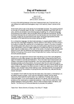 At the heart of the music is the sense of uncontainable newness. The sneering reaction on the day of Pentecost wasn’t too silly: in a sense the disciples were filled with new wine, and the old wineskins were showing signs of splitting. Or, in Pauline language, the groaning of all creation was now located within the believers themselves, so that the tension between the old world and the new had become an inner tension within the Christian, longing for the resurrection body which would give appropriate physical expression to the astonishing new energy welling up within...