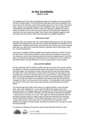 The sabbath was one of the most distinctive features of Judaism, and was guarded with fierce national pride. The Old Testament itself gave little specific guidance as to how it was to be ‘kept holy’, beyond the general injunction to ‘do no work’. But what is work, and are even necessary types of work forbidden? Here was a fertile field for scribal debate and definition, and their rules and regulations, designed to make it easier for people to know when they were and were not breaking the sabbath law, went into ever more meticulous detail. One of their chief complaints against Jesus was that he did not seem to share their enthusiasm for sabbath regulations…
