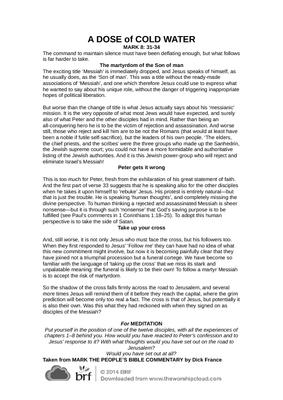 The exciting title ‘Messiah’ is immediately dropped, and Jesus speaks of himself, as he usually does, as the ‘Son of man’. This was a title without the ready-made associations of ‘Messiah’, and one which therefore Jesus could use to express what he wanted to say about his unique role, without the danger of triggering inappropriate hopes of political liberation…