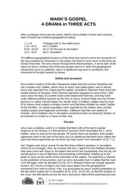 After a prologue which sets the scene, Mark’s story unfolds in three main sections, each of which has a distinct geographical setting: