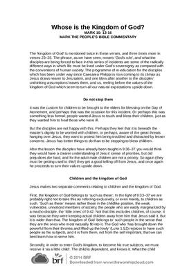 The ‘kingdom of God’ is mentioned twice in these verses, and three times more in verses 23–25. The phrase, as we have seen, means ‘God’s rule’, and what the disciples are being forced to face in this series of incidents are some of the radically different ways in which life must be lived under God’s sovereignty as compared with the conventions of human society…