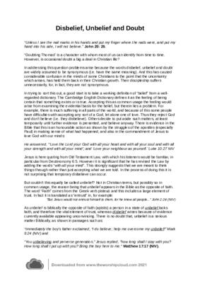 This short reflection (800 words) clarifies the Biblical meaning of and relationship between these disbelief, unbelief and doubt with particular reference to "Doubting" Thomas.