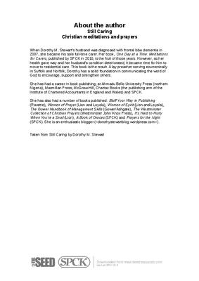 About the author Still Caring Christian meditations and prayers When Dorothy M. Stewart’s husband was diagnosed with frontal lobe dementia in 2007, she became his sole full-time carer. Her book, One Day at a Time: Meditations for Carers, published by SPCK in 2010, is the fruit of those years. However, as her health gave way and her husband’s condition deteriorated, it became time for him to move to residential care. This book is the result...