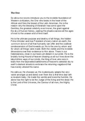 itself. He is the ultimate purpose and destiny of all things, the hidden Prime Minister and true President of every nation on earth; the summum bonum of all that humanity can offer and the costliest condescension of God towards us. He is the one by whom and for whom all things were made. Both the visible and the invisible dimensions owe their existence to Him alone.