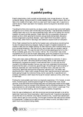 Ralph’s deterioration, both mentally and physically, took a huge downturn. He was constantly falling, finding himself in a totally agitated state, unable to stand. After two falls in the middle of the night, which my carer and I had to cope with, it was time to call the doctor. Ralph was taken into hospital, where he stayed for seventeen and a half weeks...