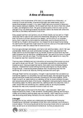 A romance, in the truest sense of the word, is a wonderful time of discovery – a meeting of minds and bodies, of personal strengths and weaknesses, and of tenderness between a couple. In my case, Ralph had many moments of discovery about issues relating to disability. Yet he coped with them all, took to them like a duck to water, and delighted in them. We gave ourselves plenty of time to work out the strength of our own feelings towards one another, before we shared with others the fact that our friendship had become much more...