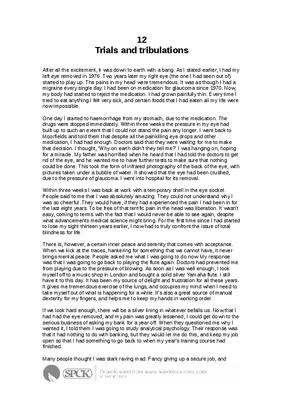 After all the excitement, it was down to earth with a bang. As I stated earlier, I had my left eye removed in 1976. Two years later my right eye (the one I had seen out of) started to play up. The pains in my head were tremendous. It was as though I had a migraine every single day. I had been on medication for glaucoma since 1970. Now, my body had started to reject the medication. I had grown painfully thin. Every time I tried to eat anything I felt very sick, and certain foods that I had eaten all my life were now impossible..