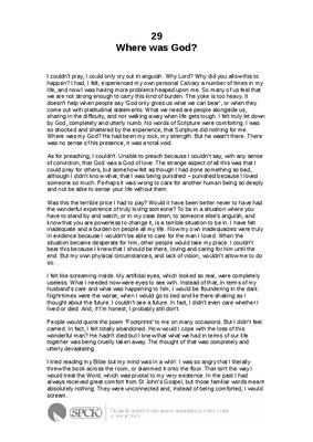 I couldn’t pray, I could only cry out in anguish. Why Lord? Why did you allow this to happen? I had, I felt, experienced my own personal Calvary a number of times in my life, and now I was having more problems heaped upon me. So many of us feel that we are not strong enough to carry this kind of burden. The yoke is too heavy. It doesn’t help when people say ‘God only gives us what we can bear’, or when they come out with platitudinal statements. What we need are people alongside us, sharing in the difficulty, and not walking away when life gets tough. I felt truly let down by God, completely and utterly numb. No words of Scripture were comforting. I was so shocked and shattered by the experience, that Scripture did nothing for me. Where was my God? He had been my rock, my strength. But he wasn’t there. There was no sense of his presence, it was a total void...