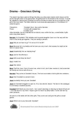 This sketch has been used at All Age Worship, as a discussion starter which draws out the points that gifts need to be appropriate, thoughtful and for the benefit of the receiver. It would be suitable for Advent and Christmas as well as Pentecost where