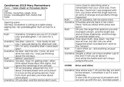 Cast Old Mary, Young Mary, Joseph, Anna, Simeon, Granddaughter Ruth, Market Stall holder
