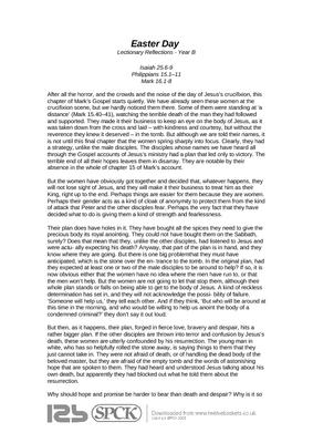 After all the horror, and the crowds and the noise of the day of Jesus’s crucifixion, this chapter of Mark’s Gospel starts quietly. We have already seen these women at the crucifixion scene, but we hardly noticed them there. Some of them were standing at ‘a distance’ (Mark 15.40–41), watching the terrible death of the man they had followed and supported. They made it their business to keep an eye on the body of Jesus, as it was taken down from the cross and laid – with kindness and courtesy, but without the reverence they knew it deserved – in the tomb. But although we are told their names, it is not until this final chapter that the women spring sharply into focus. Clearly, they had a strategy, unlike the male disciples. The disciples whose names we have heard all through the Gospel accounts of Jesus’s ministry had a plan that led only to victory. The terrible end of all their hopes leaves them in disarray. They are notable by their absence in the whole of chapter 15 of Mark’s account...