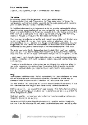 The story of the resurrection from Matthew 28 as told by a Soldier, Mary Magdalene, Joseph of Arimathea and a disciple.