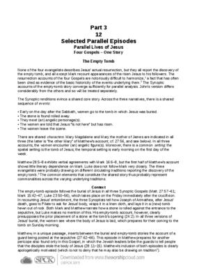 None of the four evangelists describes Jesus’ actual resurrection, but they all report the discovery of the empty tomb, and all except Mark recount appearances of the risen Jesus to his followers. The resurrection accounts of the four Gospels are notoriously difficult to harmonize, a fact that has often been cited as evidence of the basic historicity of the events underlying them. The Synoptic accounts of the empty-tomb story converge sufficiently for parallel analysis. John’s version differs considerably from the others and so will be treated separately…