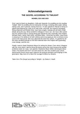 First I want to thank my daughters, Holly and Jeanette, for prodding me into reading Twilight. Well, for prodding me into doing lots of things, including white-water rafting, eating sushi, and in general, having more fun. I’m also grateful to Randy for being so patient and forgiving as I hole up to read, think, and write. My research assistants, Mireya Martinez and Shellie Ross, have been angels, helping with all kinds of little details along the way. What wonderful colleagues I have, too, who have often asked how the vampire book is coming along and wished me well, especially John Holbert, Michael Hawn, Jamie Clark-Soles, and Beka Miles. I think that my editor, Jana Riess, is amazing in her ability to be both ruthless and encouraging as she scrutinizes every word in the manuscript. She truly calls forth the best from writers. I’m grateful for all the other wonderful people on the WJK editorial team who helped with typesetting, cover design, and the rest...
