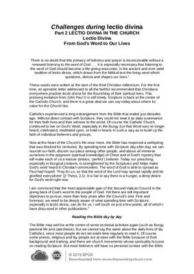 There is no doubt that this primacy of holiness and prayer is inconceivable without a renewed listening to the word of God . . . It is especially necessary that listening to the word of God should become a life-giving encounter, in the ancient and ever valid tradition of lectio divina, which draws from the biblical text the living word which questions, directs and shapes our lives…