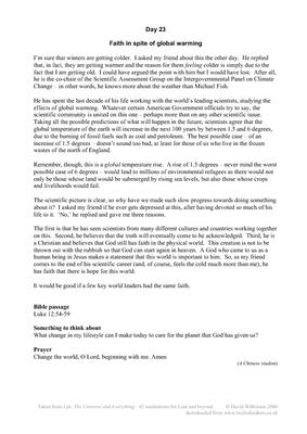Thoughts taken from TV, Books and life experiences on various topics and given a Christian slant to stimulate thoughts. The topic here for Day 23 is 'Global Warming'.