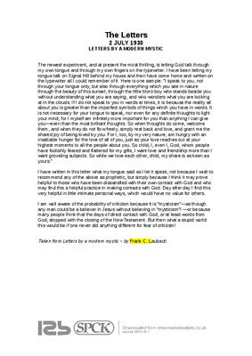 The newest experiment, and at present the most thrilling, is letting God talk through my own tongue and through my own fingers on the typewriter. I have been letting my tongue talk on Signal Hill behind my house and then have come home and written on the typewriter all I could remember of it. Here is one sample: “I speak to you, not through your tongue only, but also through everything which you see in nature through the beauty of this sunset, through the little Moro boy who stands beside you without understanding what you are saying, and who wonders what you are looking at in the clouds. If I do not speak to you in words at times, it is because the reality all about you is greater than the imperfect symbols of things which you have in words. It is not necessary for your tongue to speak, nor even for any definite thoughts to light your mind, for I myself am infinitely more important for you than anything I can give you—even than the most brilliant thoughts. So when thoughts do come, welcome them, and when they do not flow freely, simply rest back and love, and grant me the shared joy of being loved by you. For I, too, by my very nature, am hungry with an insatiable hunger for the love of all of you, just as your love reaches out at your highest moments to all the people about you. So child, I, even I, God, whom people have foolishly feared and flattered for my gifts, I want love and friendship more than I want groveling subjects. So while we love each other, child, my share is as keen as yours.”...