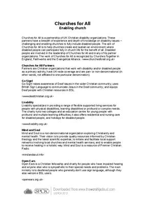Churches for All is a partnership of UK Christian disability organizations. These partners have a breadth of experience and depth of knowledge on disability issues – challenging and enabling churches to fully include disabled people. The aim of Churches for All is to help churches create and sustain an environment where disabled people can participate fully in church life for the benefit of all. Disabled people are involved in the leadership of Churches for All and many of its partner organizations. The work of Churches for All is recognized by Churches Together in England, Faithworks and the Evangelical Alliance. ‹www.churchesforall.org.uk›