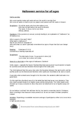 This service seeks to avoid unhealthy focus on evil spirits whilst giving due regard to the saints and souls aspect. The historical background is treated simply giving a rationale for some of the fun activities of the occasion