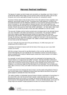 This short (845 words) reflection/sermon examines various customs associated with Harvest Festivals. Coming together to give thanks and to celebrate God's provision are seen as common to all forms and traditions of traditional Harvest Festivals