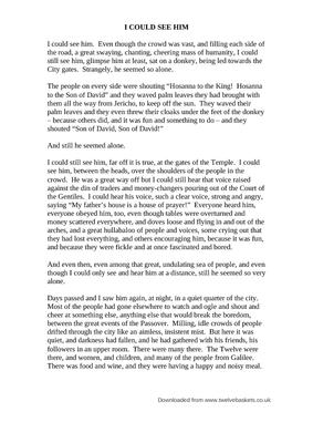 I could see him. Even though the crowd was vast, and filling each side of the road, a great swaying, chanting, cheering mass of humanity, I could still see him, glimpse him at least, sat on a donkey, being led towards the City gates. Strangely, he seemed so alone.