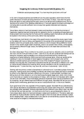 Jesus takes what is to hand and already in place and transforms it so that the promise of happiness, togetherness and sharing can be realised to the full, exceeding all expectations of those present and ensuring that the hosts and the wedding couple themselves will afterwards be lauded in the memory of the community rather than reproached.That emptiness, both literal in the case of the guest's empty cups and the empty jugs of wine on the tables with none to follow, and figurative in the sense of the emotional pain and social isolation which the principals avoid, clearly matters to John's Gospel. Being fulfilled is God's answer to the world's angst-ridden emptiness, and it is an answer that is freely, extravagantly and powerfully offered through Jesus, the fulfilling Word of Life made flesh and blood real