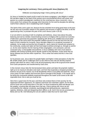 As Jesus is handed the Isaiah scroll to read in his home synagogue, Luke delights in setting the narrative stage for the heart of this ancient text to be proclaimed afresh with power and passion as a potent paradigmatic manifesto for the contemporary Jesus movement. Jesus cherry picks from scripture the passage which becomes for him and his disciples the defining motif of their collective role in establishing God's Kingdom.