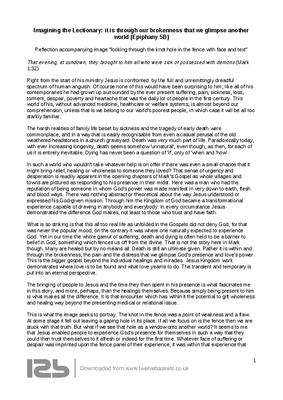 Right from the start of his ministry Jesus is confronted by the full and unremittingly dreadful spectrum of human anguish. Of course none of this would have been surprising to him; like all of his contemporaries he had grown up surrounded by the ever present suffering, pain, sickness, loss, torment, despair, poverty and heartache that was the daily lot of people in the first century. This world of his, without advanced medicine, healthcare or welfare systems, is almost beyond our comprehension, unless that is we belong to our world's poorest people, in which case it will be all too starkly familiar.