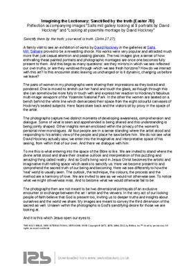 A family visit to see an exhibition of works by David Hockney in the galleries at Salts Mill, Saltaire proved to be a rewarding choice. His works were very popular and attracted much more than just casual attention and passing glances. The two images give a sense of how enthralling these painted portraits and photographic montages are once one becomes fully present to them. And this begs so many questions: are they mirrors in which we see reflected our own truths, or are they windows through which we see fresh horizons How do we interact with this art Is this encounter static leaving us unchanged or is it dynamic, changing us before we leave.
