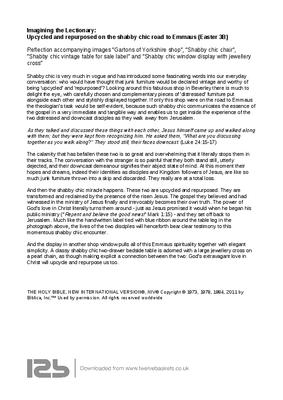 Shabby chic is very much in vogue and has introduced some fascinating words into our everyday conversation: who would have thought that junk furniture would be declared vintage and worthy of being 'upcycled' and 'repurposed' Looking around this fabulous shop in Beverley there is much to delight the eye, with carefully chosen and complementary pieces of 'distressed' furniture put alongside each other and stylishly displayed together. If only this shop were on the road to Emmaus the theologian's task would be self-evident, because such shabby chic communicates the essence of the gospel in a very immediate and tangible way and enables us to get inside the experience of the