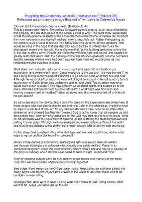 This is a house with history. The mellow Cotswold stone leaves no doubt as to what befell this property, the question posed to the casual viewer is why? The most likely explanation is that this an extreme example of the consequences of the infamous window tax, to which the more modern phrase 'daylight robbery' seems singularly apt. Rather than paying up, the owners could choose to reduce their bill by blocking up some of their windows. This would be done in the hope that one day they would be free to unblock them. As the photograph shows only too well, the reality was that for this building and many others like it, that day is still to come. People learned to live with less light and sound, and adapted to greatly restricted views. With the passing of time this situation gradually became normative and the memory of what once had been was lost from mind and recollection; all that remained was the evidence in stone. What does such a drastic reduction in vision, sight and sound do spiritually to our expectation and awareness? When Jesus responds to the question "are you the one?" he does so by telling John the Baptist's disciples to go and tell John what they see and hear. Although he was locked up and shut away out of sight and sound in Herod's prison, John's expectation of God's action was undimmed and at fever pitch. The question was what would such action look like? And how different would these sights and sounds be to the one's John had anticipated from his point of view? In what ways was his vision and hearing compromised or modified? What windows onto God were blocked off or tinted in his perception? So as he speaks to the crowds Jesus calls into question the expectation and awareness of these people who had also flocked to see and hear John in the wilderness.