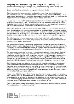 I wonder what he expected Was acknowledgement from one in a hundred pedestrians enough, one in fifty, one in a thousand Or was it about going on for as long as it took to collect enough cash in the bucket to buy a meal Or was the essence of this performance that it was primarily some sort of gift, an act of art independent of being seen, appreciated or responded to?