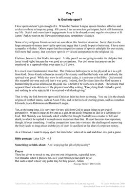 Thoughts taken from TV, Books and life experiences on various topics and given a Christian slant to stimulate thoughts. The topic here for Day 7 is 'Sport'. Bible reading: Luke 5: 29-6.5