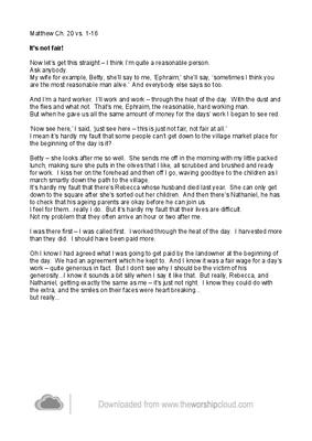And I’m a hard worker. I’ll work and work – through the heat of the day. With the dust and the flies and what not. That’s me, Ephraim, the reasonable, hard working man. But when he gave us all the same amount of money for the days’ work I began to see red. ‘Now see here,’ I said, ‘just see here – this is just not fair, not fair at all.’ I mean it’s hardly my fault that some people can’t get down to the village market place for the beginning of the day is it?