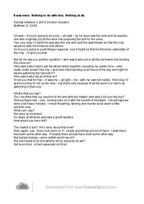 But let me ask you another question – who was it who put in all the hard work into tending the vines eh? Who was it who had to get his whole family together, including my auntie Vera – who really, really doesn’t like me – and have them working at all hours of the day and night for weeks gathering the harvest in? Who was it who did all of that eh? I’ll tell you that for free – it was me – all right – me - with my own fair hands. Well okay I’ll grant you they’re not so fair now – but that’s only because of all the work I’ve had to do gathering in that crop.