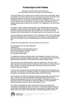 This verse (Psalm 51.6 kjv) does not come with the word ‘heart’ in the psalm version of the Book of Common Prayer but for me it has been at the centre of my faith. Even though the Hebrew is not clear, the words capture the transparency of our relationship with God. ‘No secrets are hid’ from his eyes. He sees into us and knows us more fully than we know ourselves. Coming to a crisis in life when so much is stripped away brings us nearer to our true self. In our inadequacy to the trial we feel our frailty...
