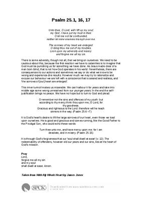 There is some adversity, though not all, that we bring on ourselves. We need to be cautious about this, because the first reaction we have to calamities is to imagine that God must be punishing us for something we have done. As Jesus made clear of a man born blind, that is not how God operates in his world. Nevertheless, there are consequences to our actions and sometimes we say or do what we know to be wrong and experience dire results. However much we may try to rationalize and excuse our behaviour we are left with a conscience that is seared and restless, and ‘the sorrows of [our] heart are enlarged’...