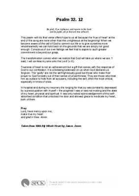 This psalm with its final verse offers hope to us all because the ‘true of heart’ at the end of the song are none other than the unrighteous at the beginning! When we become aware of the call of God to commit our life or to give ourselves more wholeheartedly we can hold back on the grounds that we are simply not good enough. Conscious of our own failings we feel that to aspire to such greater commitment is beyond our grasp...