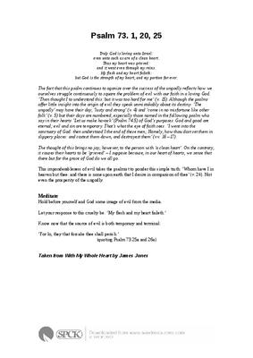 The fact that this psalm continues to agonize over the success of the ungodly reflects how we ourselves struggle continuously to square the problem of evil with our faith in a loving God. ‘Then thought I to understand this: but it was too hard for me’ (v. 15). Although the psalms offer little insight into the origin of evil they speak unmistakably about its destiny. ‘The ungodly’ may have their day, ‘lusty and strong’ (v. 4) and ‘come in no misfortune like other folk’ (v. 5) but their days are numbered, especially those named in the following psalm who say in their hearts ‘Let us make havock’ (Psalm 74.5) of God’s purposes. God and good are eternal; evil and sin are temporary. That’s what the eye of faith sees. ‘I went into the sanctuary of God: then understood I the end of these men; Namely, how thou dost set them in slippery places: and castest them down, and destroyest them’ (vv. 16 –17)...