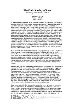 At last a nice easy covenant. At last, Jeremiah seems to be suggesting, God will give up trying to teach us things and just zap us, changing us so that it becomes natural to us to know God. We won’t need to be taught, we won’t need to ask others, or experiment or learn about God through rehearsing past history. God will be part of us, written on our hearts. But I’m sorry to have to tell you that it isn’t that simple. Although the emotion that is upper- most in this passage is longing – for the time when God and his people will be united – there is also anger and despair. The words that Jeremiah is speaking to his people on behalf of God are very hard to hear. For one thing, he is saying that the covenant that constituted them as God’s people in the first place has been broken. The story of the Exodus is a foundational story for the people, and they base all their identity and their claims on God on that covenant. But Jeremiah says, very baldly, ‘You broke that covenant. It’s dead and gone.’ He is also implying that the people are actually incapable of faithfulness and love of God...