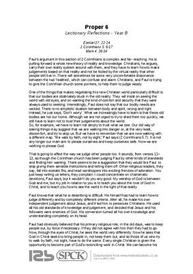 Paul’s argument in this section of 2 Corinthians is complex and far- reaching. He is putting forward a whole new theory of reality and knowledge. Christians, he argues, carry their own reality system around with them, and they have to learn how to make judgements based on that reality and not be fooled by the virtual reality that other people still live in. There will sometimes be some very uncomfortable dissonance between the two ‘realities’, which can confuse and alarm Christians, and Paul is trying to give the Corinthian church some pointers, to help them to judge wisely....