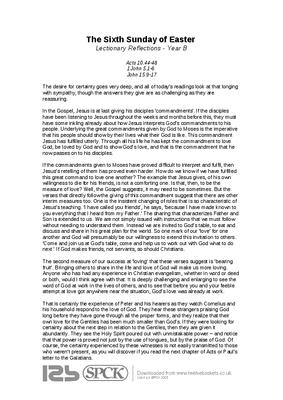 In the Gospel, Jesus is at last giving his disciples ‘commandments’. If the disciples have been listening to Jesus throughout the weeks and months before this, they must have some inkling already about how Jesus interprets God’s commandments to his people. Underlying the great commandments given by God to Moses is the imperative that his people should show by their lives what their God is like. This commandment Jesus has fulfilled utterly. Through all his life he has kept the commandment to love God, be loved by God and to show God’s love, and that is the commandment that he now passes on to his disciples...