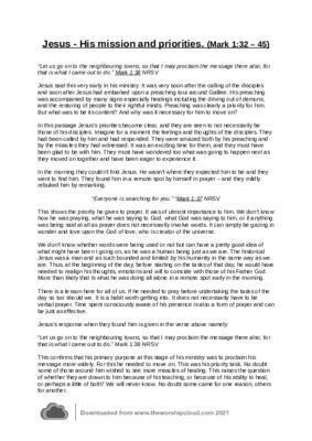 This reflection/short sermon (1291 words) focuses upon Jesus decision to move on in his ministry around Galilee. The priorities of prayer and of preaching in His life are clearly seen. The implications for his followers are also drawn out.