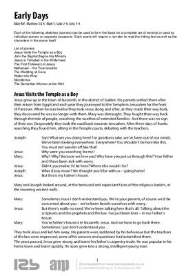 Each of the following sketches (scenes) can be used to form the basis for a complete act of worship or used as individual scenes on separate occasions. Each scene will require a narrator to read the linking text as well as the characters in the scene itself.